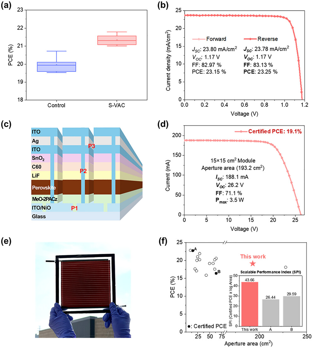 실증 결과, 연구팀은 15cm×15cm 크기의 대면적 기판에서도 용액공정으로 결함 없이 균일한 페로브스카이트 박막을 제조했으며, 이를 적용한 미니 모듈은 19.1%의 광전변환 효율을 달성했다. 또한 1년 이상의 실외 구동 테스트에서도 초기 효율의 94% 이상을 유지해 장기 안정성까지 입증했다.